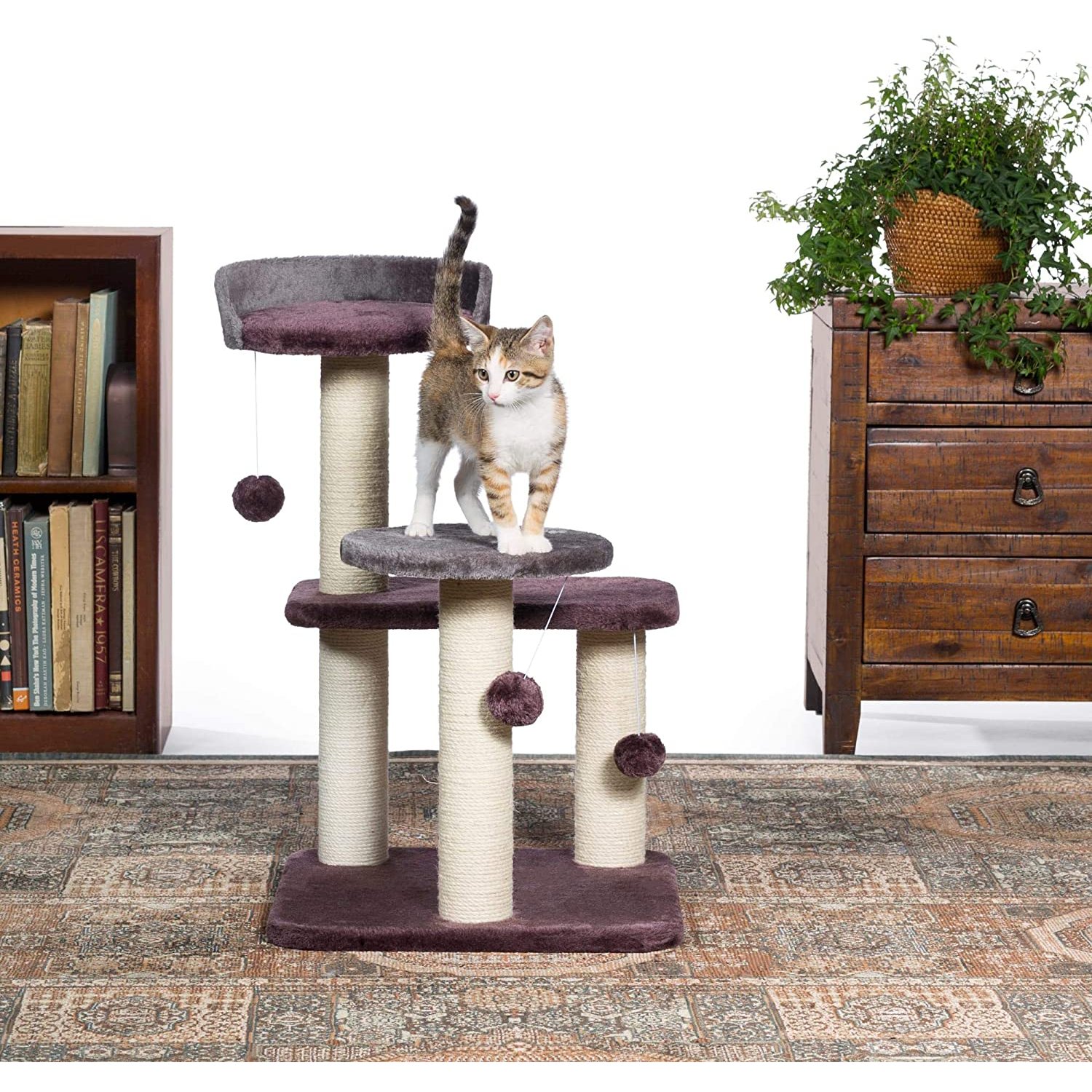 • Three plush, dangling, swat toys encourage kitty to play