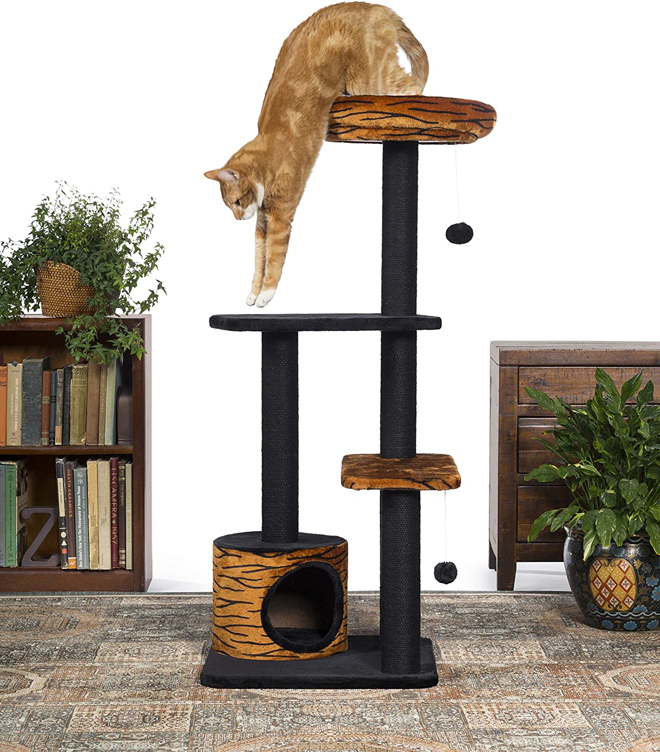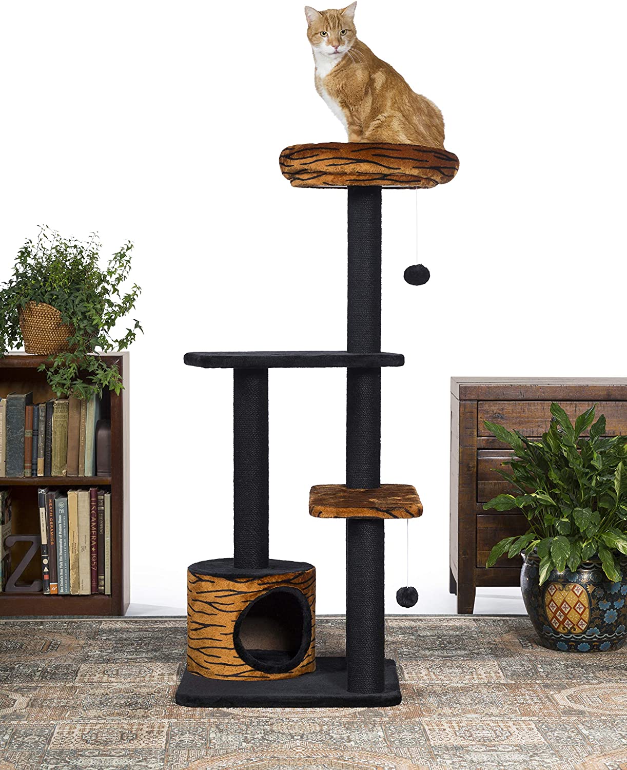 Prevue Pet Products Kitty Power Paws Tiger Tower 7303 combines super soft, plush fabrics with durable jute to provide the perfect place for lounging, sleeping, scratching, hiding and playing. A luxurious tiger print bolstered day bed is a great spot for your kitten or cat to survey its surroundings or take a cat nap. Two plush, dangling, swat toys hang playfully - one from the large cat bed and one from the lower plush platform. Five individual, durable, jute rope scratching posts offer an appealing texture to cats, curbing inappropriate scratching behaviors and saving your sofa. In addition to the cat bed, two rectangular platforms provide opportunities for pouncing and jumping or multiple levels for more than one cat to lounge comfortably. A lower level hideout makes your cat or kitten feel more secure and minimizes social stress. At 4 foot tall, this cat tree utilizes vertical space and a compact footprint to save space in your home while offering your kitty plenty of options to play, sleep and lounge. Expertly designed cat furniture assembles easily and satisfies the needs of cats of all ages, sizes and activity levels. Measures 24" Long, 24" Wide and 48" High.